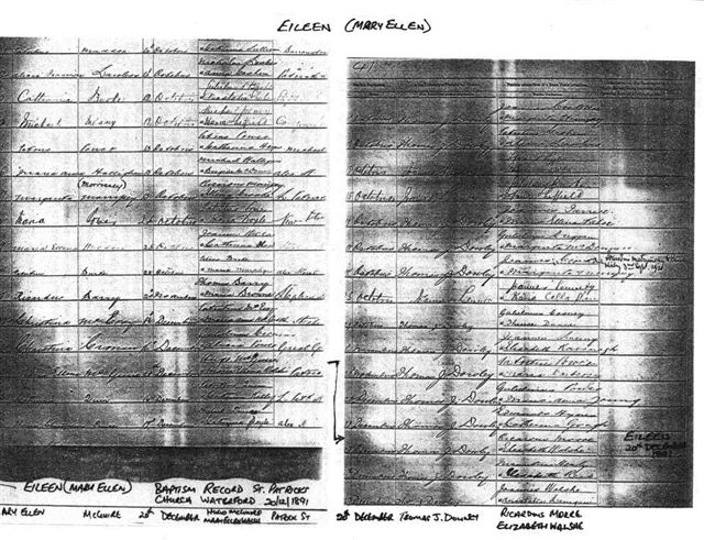 The next child born was Mary Ellen, later known as Eileen or eventually Big Eileen. She was born on January 3, 1892, but I have found that she was baptised on December 20, 1891. In 1894, her sister, Harriet was born. Her date of birth was June 1, 1894. It was after this date that the family then moved to Evelyn Street, in the Tiger Bay area of Cardiff, Now began the Welsh and English connection of the McGuire family from Waterford, Ireland.