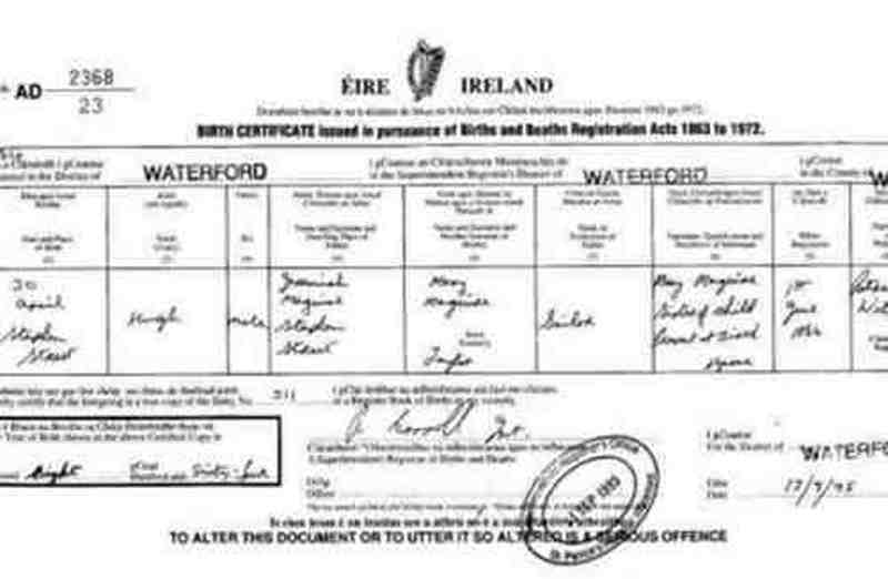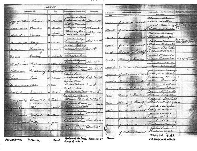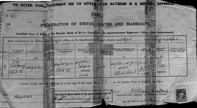 Hugh's birth was registered by his sister Mary who was present at the birth.. It is believed that sometime later Mary emigrated too America and married somebody rich, possibly in the Baltimore area, but could have been anywhere. This information has been passed down by word of mouth. While in Waterford in 1999 and talking to Jimmy McGuire who lives in Spring Garden Alley, he said that the family had been approached recently by an American Lawyer looking for relatives of a MCGUIRE, but they told the lawyer that they did not know of the McGuire's that he was looking for and that they were not relative's. Unfortunately, they Irish clan were unaware at the time of the family in Wales. Could the relatives they were looking for be the relatives of Mary?