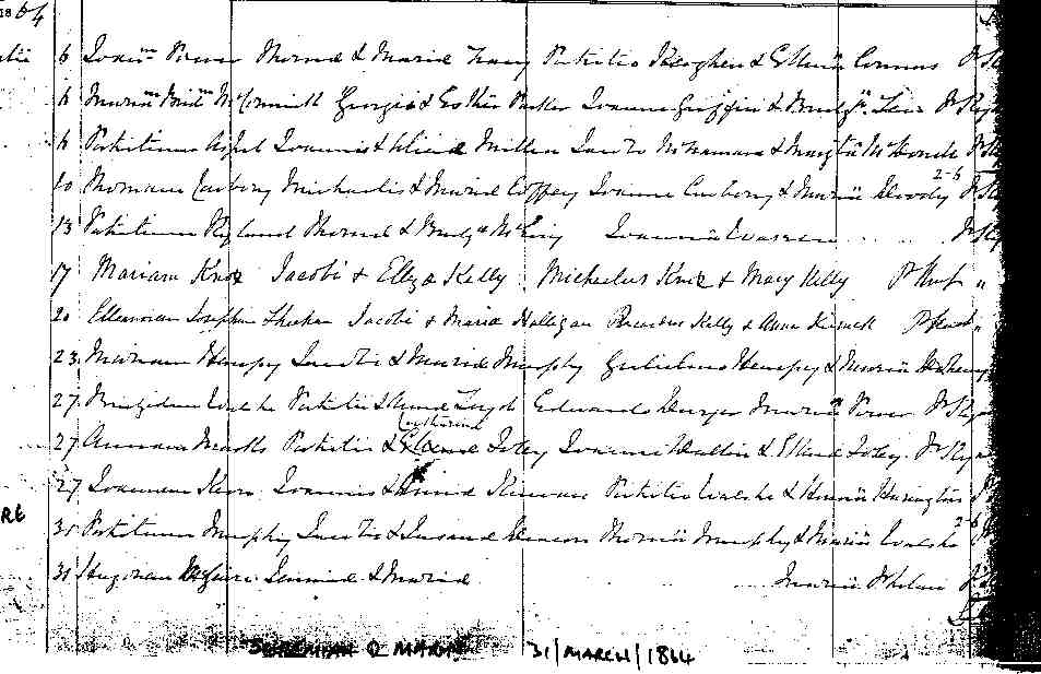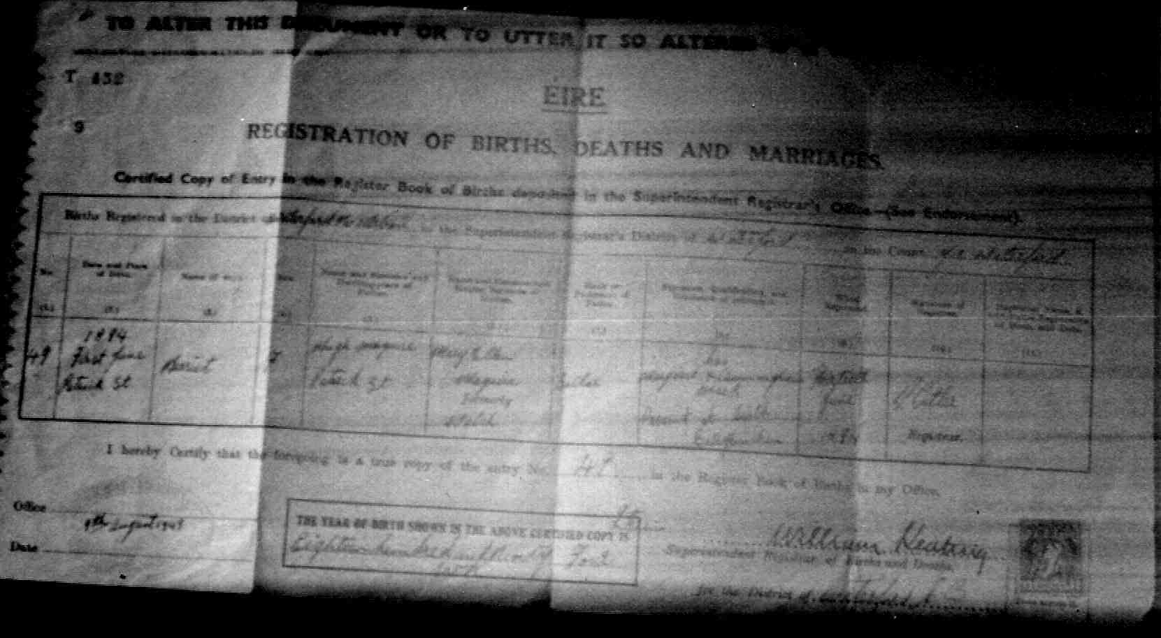 23456 Mary Ann Walsh.... June 29, 1865 Father: Laurence Mother: Mary Kirwan Sponsors: Michael Kirwan and Brigid Hasset Parish: Ballybricken Church: Ballybricken Priest: T. McGrath Register: B/1844 - 1874 P. 364 Address: Upper Yellow Road Stipend: 1/- Note.... On the church baptism record, Mary's second name is Ann but in her civil registration, this name has now changed to Ellen.
