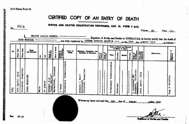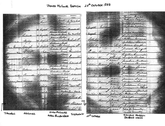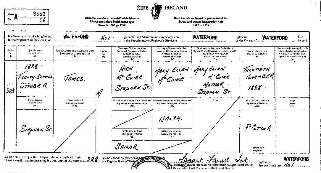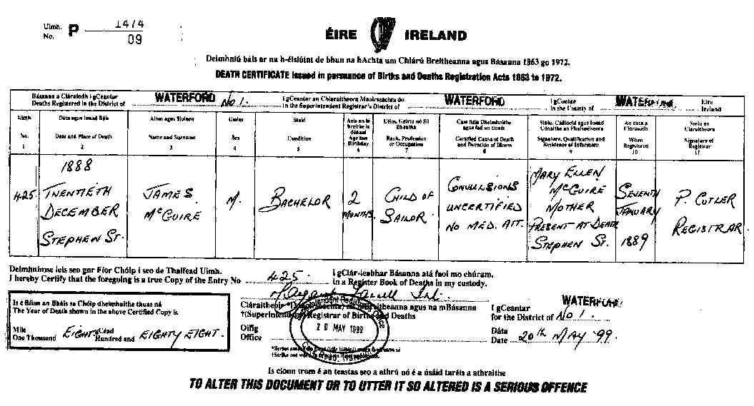 At some time Hugh and Mary married and their first child was James McGuire. James was born on October 28, 1888 but unfortunately died on December 20, 1888. He died from Convulsions that were un-certified as there was no medical presence at the time of death. His mother Mary Ellen registered the death.