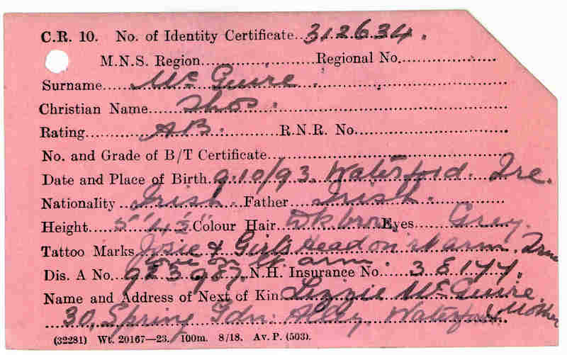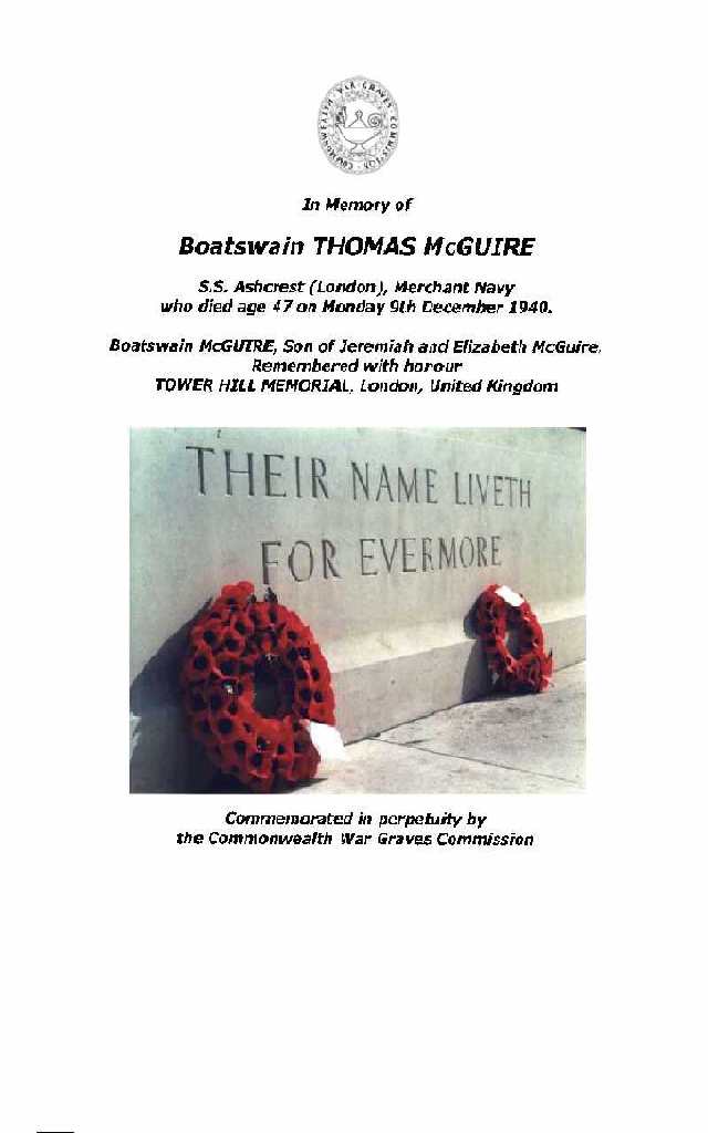 Thomas McGuire was aged 47 when he died on December 9, 1940. Thomas was the Boatswain (Bosun) on the SS. Ashcrest that was sunk by the German Uboat, U140 about 60 miles west of Northern Ireland in the Atlantic.