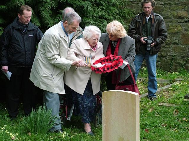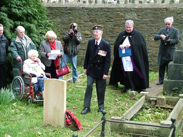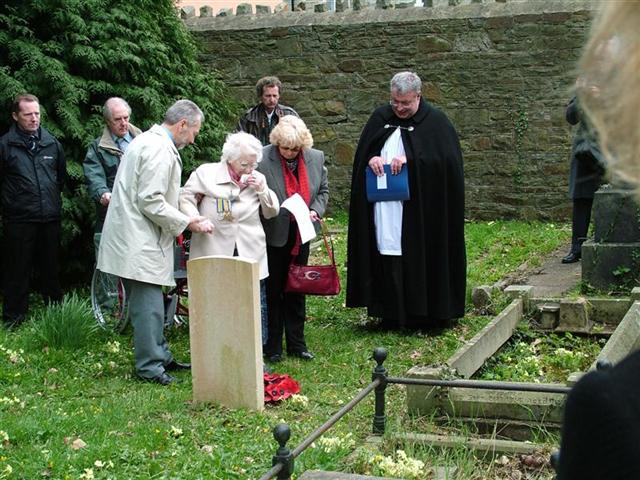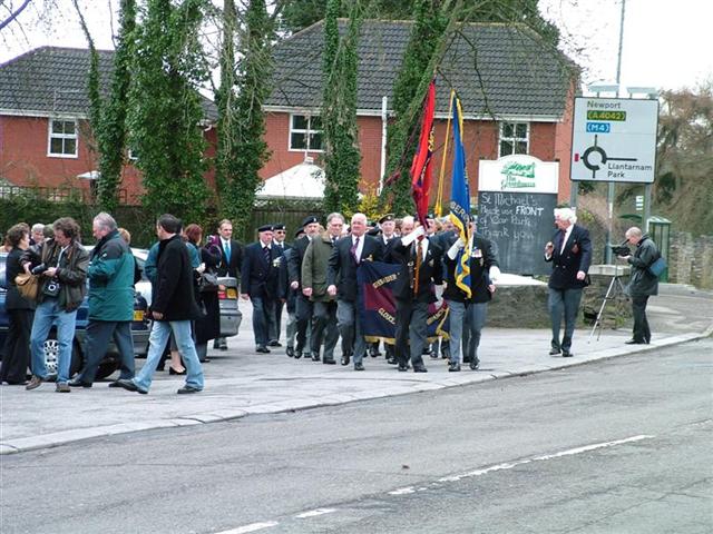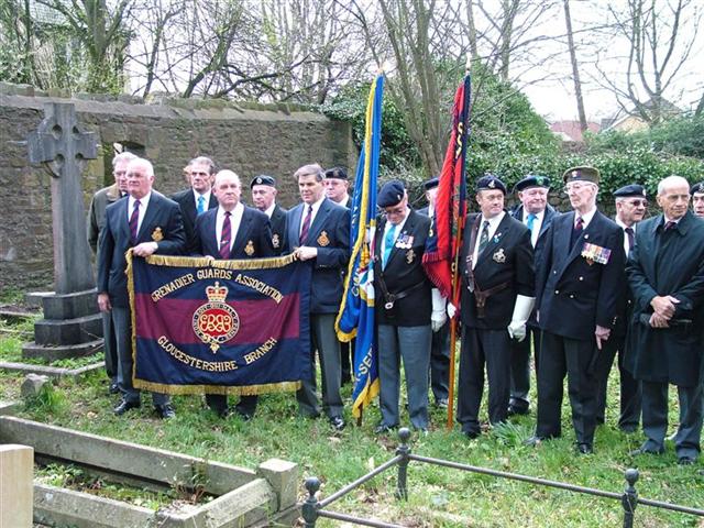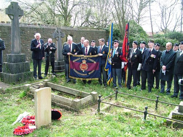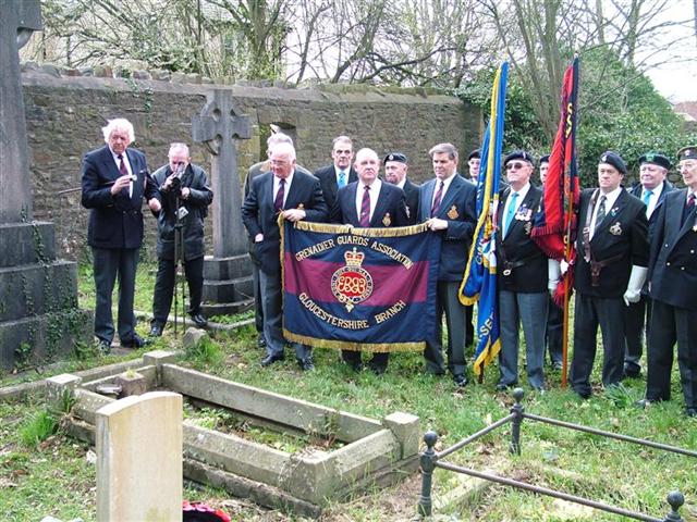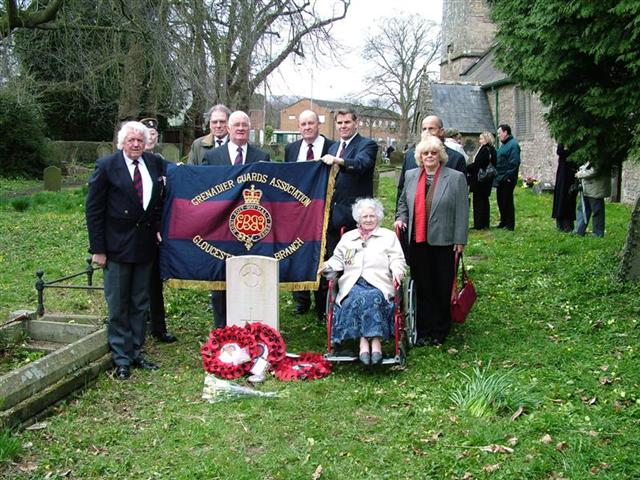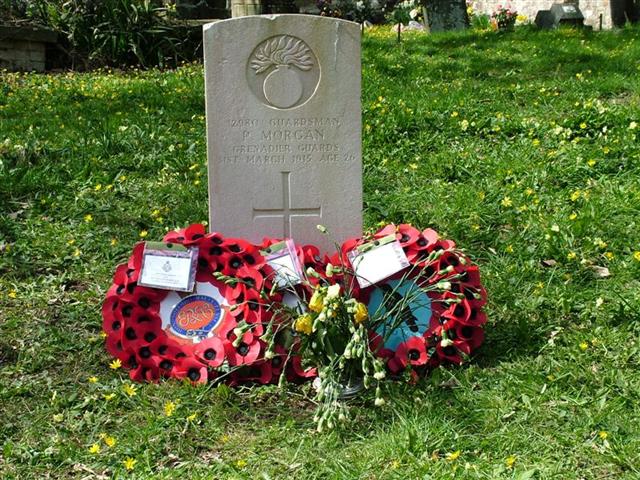 Memorial ____________________ On Sunday 2 April 2006 there was a graveside service to Pte Penry Morgan of the Grenadier Guards on the anniversary of his death 91 years ago. A web page about Penry can be found by clicking on the Roll of Honour on the far left of the screen or CLICK HERE A small parade consisting of the Gloucestershire branch of the Grenadier Guards Association, CADESA (Cwmbran and District Ex-Servicemens Association) and the Royal Engineers Association formed in the car park of the nearby public house, the Greenhouse and then marched to the entrance of St Michaels and All Angels church, Llantarnam, Gwent. Pte Penry Morgan is buried in the only Commonwealth War Grave in the churchyard and it is located at the rear of the church. The parade was halted at the entrance to the church and then dismissed as the route to the grave through the church is unsuitable for marching. The ex-servicemen followed by many family members proceeded to the grave where the Revd Gareth Evans, vicar of the church was awaiting their arrival. When everyone was in their positions the Vicar started the service with an introduction about Penry and his regiment and describing the manner in which he was mortally wounded at the battle of Neuve Chapelle on 12 March 1915. This was followed by readings from the bible, prayers and then the Lords Prayers. Following the Lords Prayer, the Guard of Honour was brought to attention and the Exhortation was said which was then followed by the Last Post, 1 min silence and then the Reveille. There then followed the laying of wreaths, firstly by Doreen Meredith the 91 year old daughter of Penry, then the Grenadier Guards Association and then by CADESA and the Royal Engineers. Finally the Vicar the Rev Gareth Evans then gave his blessing and the dismisal. Afterwards everyone went to the local Territorial Army Centre where there were refreshments available from the bar and a buffet that was set up by Dawn Jones, June Tamplin and June McGuire with other trays of delights brought along by other family members. This event turned out to be, not only a great tribute to one of our family members that made the ultimate sacrifice for King and Country during war time but also a very successful family reunion. ___________________